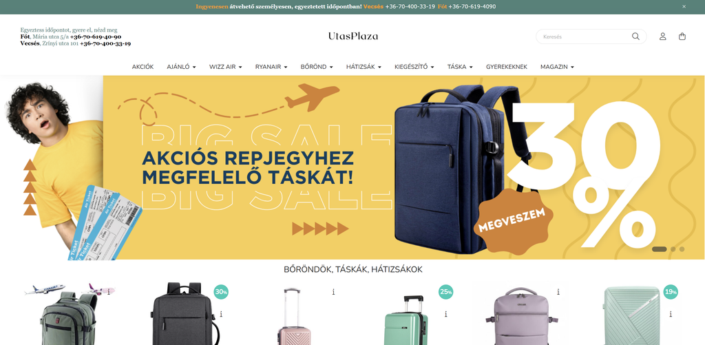 Utasplaza.hu kínálatában különböző méretű és kialakítású bőröndök találhatók, a kompakt kézipoggyászoktól a nagyobb, hosszabb utazásokhoz ideális modellekig. A webáruház kiemelt figyelmet fordít arra, hogy a légitársaságok – különösen a Wizz Air és a Ryanair – kézipoggyász-szabványainak megfelelő termékeket kínáljon, így az utazók könnyebben választhatnak olyan táskát vagy bőröndöt, amely megfelel a fedélzeti előírásoknak.